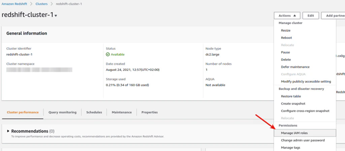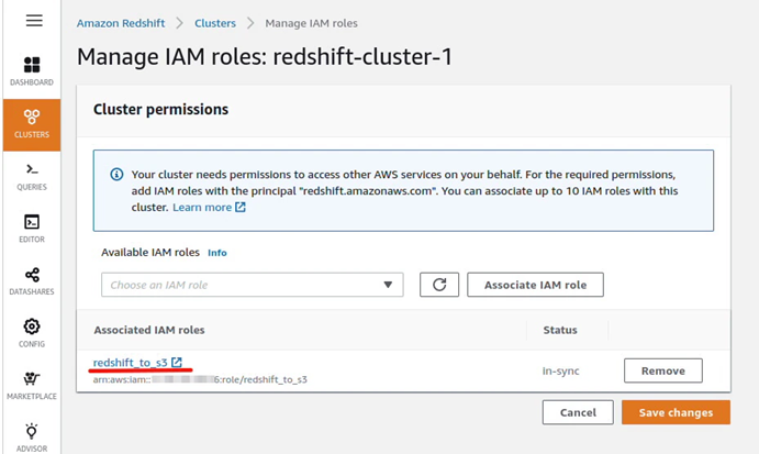 3. 绑定角色redshift_to_s3到Redshift Cluster上