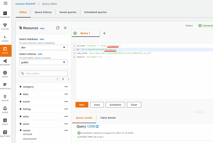 Redshift UNLOAD是官方推荐的导出方案,该方案需要使用S3,下面是一些准备工作