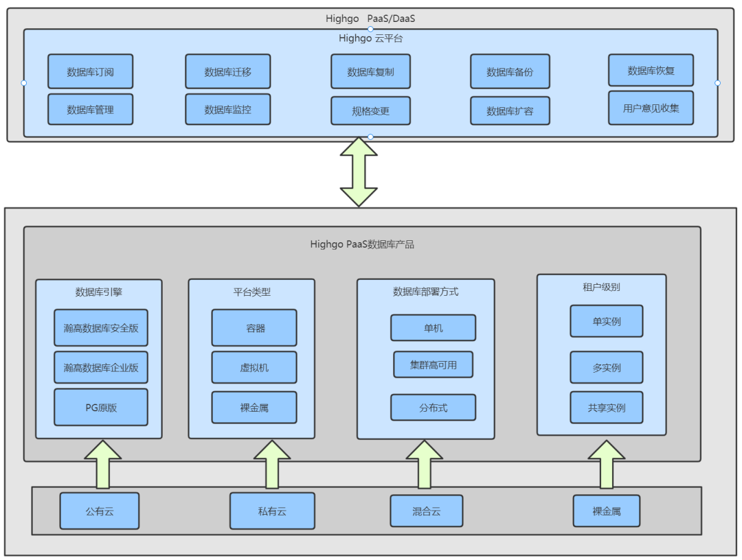 瀚高云平台依托IaaS云服务的底层资源,集成了数据库以及外围开发的各功能模块,组成了瀚高PaaS服务,该方案可广泛应用于公有云、私有云、混合云等平台架构之上。同时瀚高云平台支持在裸金属服务器上订阅数据库,实现一键式的可视化数据库发放、数据库管理及智能运维功能。为满足客户的不同需求,数据库的部署又分为单机和集群高可用,单机部署提供不同租户级别的数据库发放,并可以实现不同租户级别数据库间的资源隔离,满足用户对数据库的多样化需求; 集群高可用实现了集群快速恢复,防止业务被中断的高安全和高可靠性。