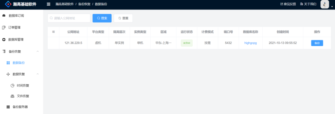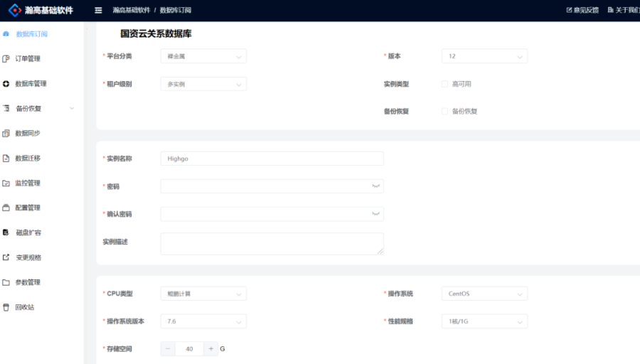 瀚高云平台支持在公有云、私有云、混合云上订阅数据库,通过可视化界面引导,由用户选择订阅的数据库引擎、操作系统、CPU/Memory/磁盘/带宽大小、数据库部署方式,即可实现分钟级数据库部署。