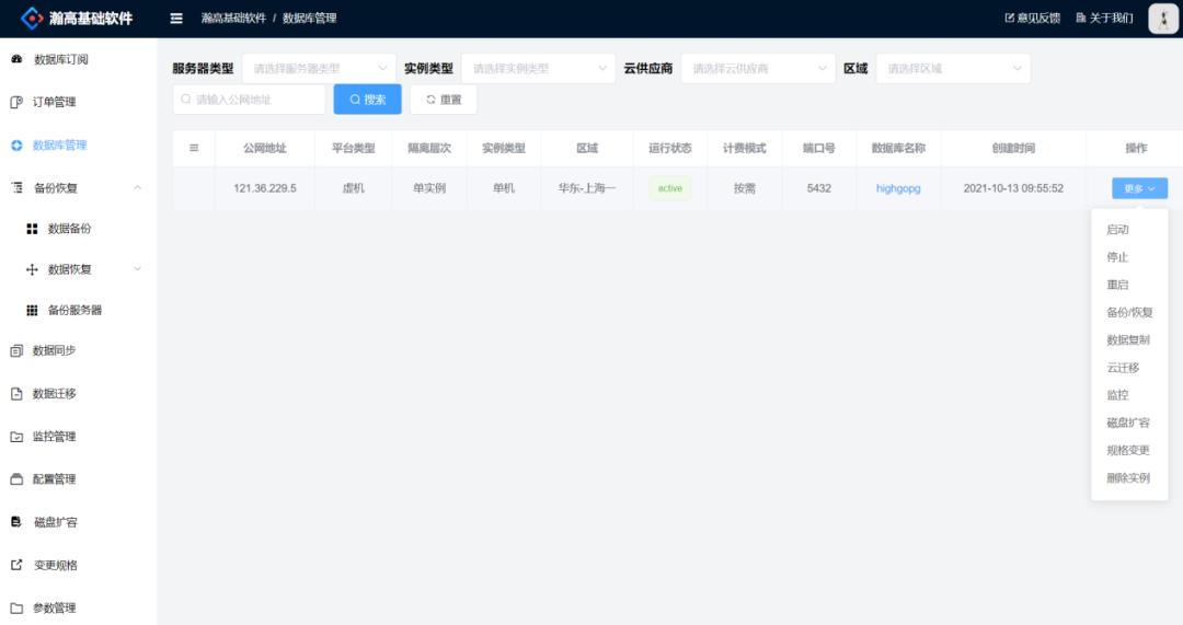 为解放企业的DBA,瀚高云平台提供了便捷的可视化数据库管理功能:停止数据库、重启数据库、删除数据库、修改数据库密码、磁盘扩容、变更规格、主备切换等功能。