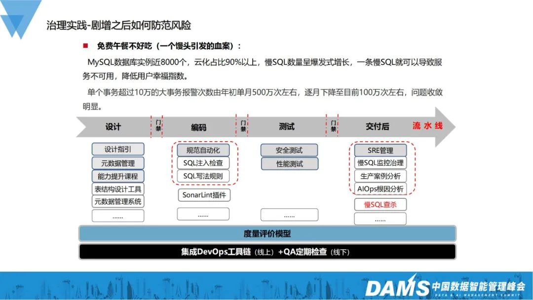 最后是交付后。在这个阶段我们会进行SRE的管理。SRE这个概念由Google首先提出,大家也正在实践过程中。但从个人角度来看,我们其实提概念要大于实施。所以参照Google的实践体系,我们重建了一个自己的SRE的管理体系,这其中就包含了慢SQL的监控治理。