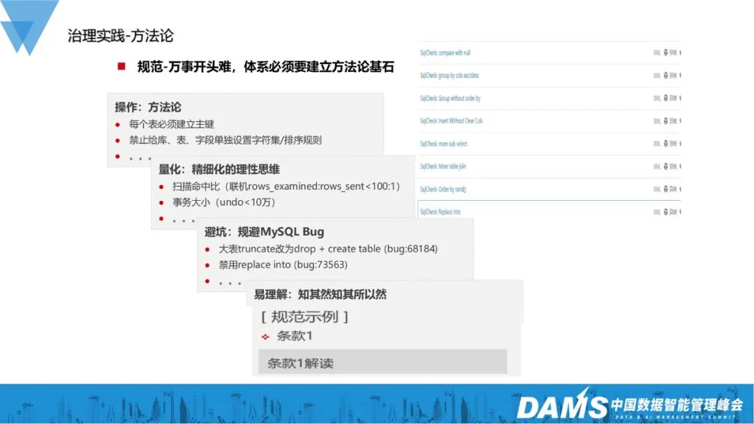 首先,在设计阶段我们会规范一些设计指引。大家如果有做过编码,或者本身就是数据库领域的专家的话就会知道,我们必须要夯实我们的方法论,而这个方法论就代表着我们设计指引的处理。比如数据库必须要建主键等,这其实都属于我们方法论的层面。