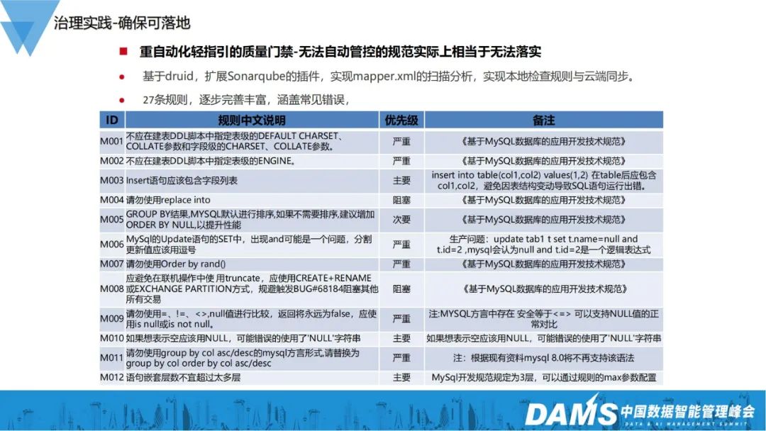 如果大家有做过代码复核或其他一些规范工作的话就会明白,人在看到东西非常多时,就会下意识地产生逃避的想法,这样很容易就会把一个本来可以控制住的场景直接忽略。像我们是基于druid扩展Sonarqube的插件,实现mapper.xml文件的扫描分析,并做到了本地检查规则与云端同步。