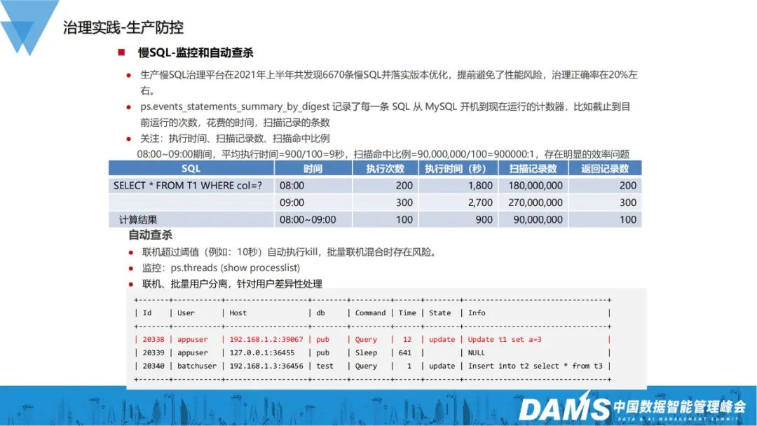 前两天碰巧看到了工行的魏老师在DAMS上演讲的主题《围剿慢SQL,工行MySQL研发管控和治理实践》,我们目前所做的一些工作和他讲的不谋而合,而且有些环节,值得我们思考和借鉴。