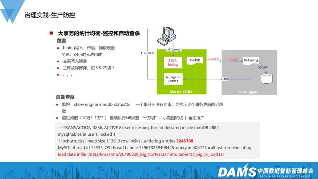 接下来是处理大事务的纳什均衡,也就是对监控和自动查杀的危害进行分析。因为我们现在的主从控制模式都是基于行复制的模式,所以,针对这种行复制模式,如果是大事务,我们binlog写入、传输,还有在备机的回放速度都会很慢。我们之前有应用被发现24小时都没有在备库完成重演,最后查出原因:因为这个表是新建的,所以它没有建主键,相当于每次都去做全扫,同时因为它是一个大事务,最后就导致24小时都没有回放完成。而解决方案也很简单,把事务量降低,同时对表进行增加主键的处理。