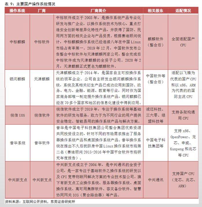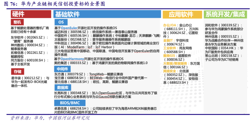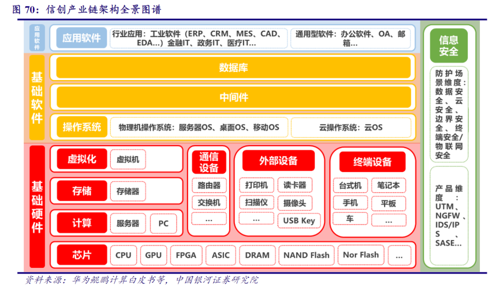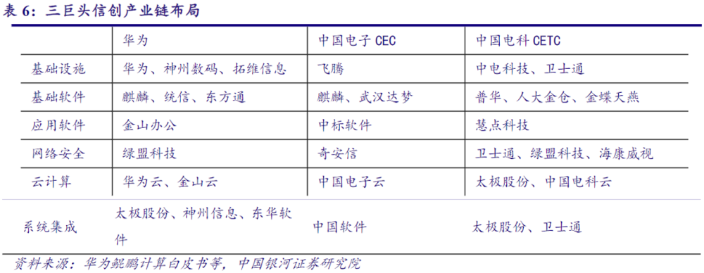 国内三大科技集团中国电子、中国电科和华为均已初步完成从底层到上层应用的全产业链打通。
