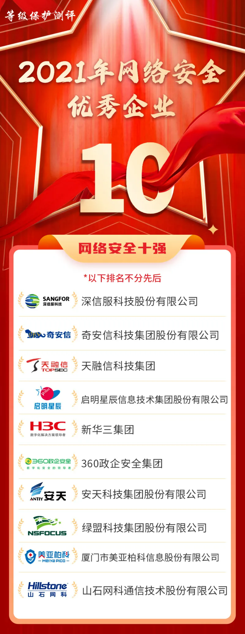 近日,由等级保护测评主办的2021年网络安全优秀企业及产品评选活动在线上成功举办,“2021年网络安全优秀企业及产品名录”隆重发布,作为专注于企业级网络安全、云计算、IT基础设施及物联网的产品和服务供应商,深信服成功入选“2021年网络安全优秀企业十强”。