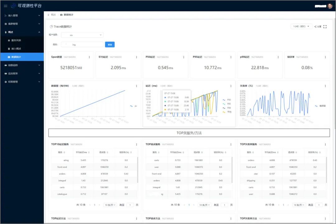 对上报的链路数据,平台同时提供了多维度的统计能力,包括租户和服务维度下的错误率、P50/P95/P99 延迟、调用次数等指标。通过该分析数据,业务可轻松地观测到某个时间段内耗时最高、成功率最差、调用次数最多的服务表现,从而帮助运营任务分析问题;同时这些统计数据也对接了外部监控组件,可按照业务自定义规则进行告警,帮助业务第一时间发现问题。