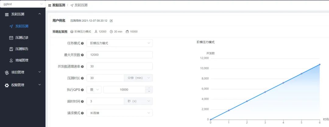 固定压力模式:并发数固定,可以设置最大 QPS 阶梯压力模式:并发数持续增加,可以设置最大并发数和最大 QPS 快速压测模式:并发数持续增加,达到指定错误率或耗时阈值后压测自动停止