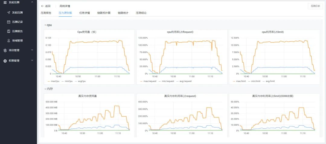 全链路压测+平台的压力源由平台托管,用户无需关注压力源。压力源基于 TKE 容器化部署,资源可以根据需要灵活扩展,理论上可以做到无限扩展。同时,平台将压力源的负载指标主动暴露出来,可以通过压测报告实时查看压力源负载数据。