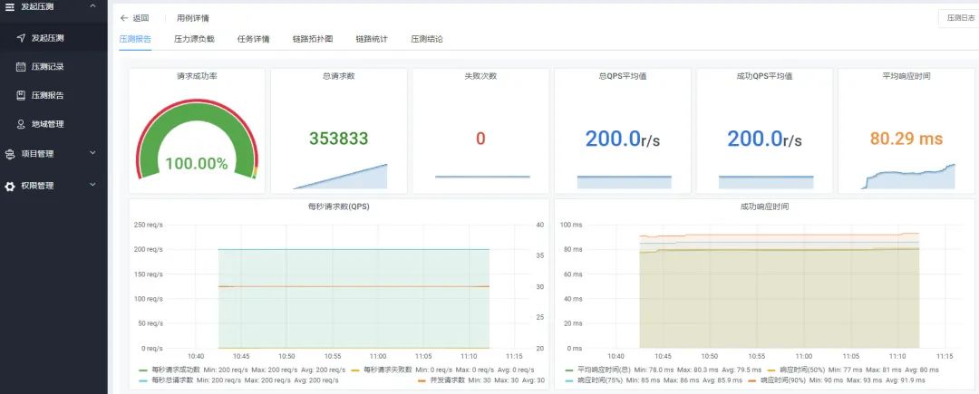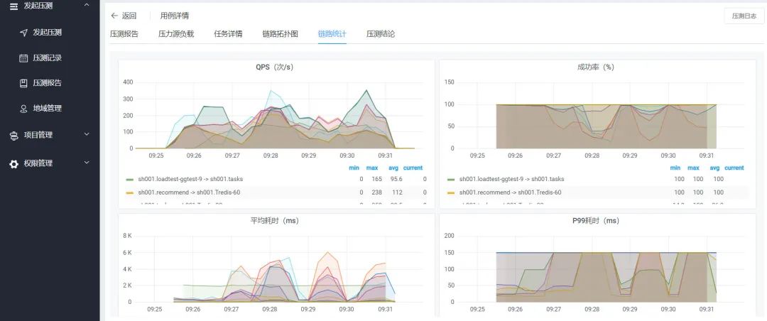 全链路压测+平台的压测工具作为请求客户端,会实时上报压测指标,在压测过程中通过压测报告能实时观测到相关的监控指标,包括 QPS、耗时、成功率等,同时能够查看压测客户端的请求返回日志。