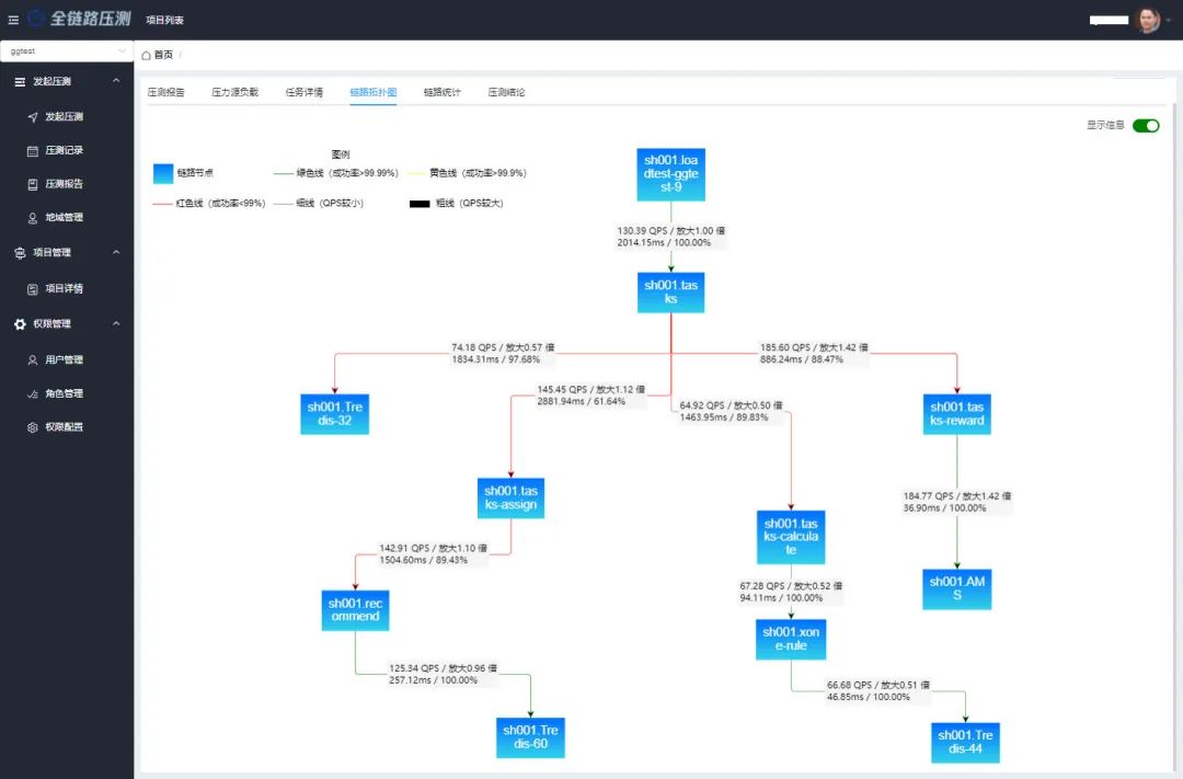 基于可观测性技术,全链路压测平台能捕获微服务间调用拓扑关系,在压测过程中,根据实际请求调用链实时生成服务间调用拓扑图,并且统计出每一层调用的黄金监控指标,如 QPS、耗时、成功率等,通过拓扑图可以一目了然的看到微服务间的放大倍数。其中对于第三方服务(如 DB)在没有上报 trace 的情况下也能通过自动补链技术计算出统计指标。