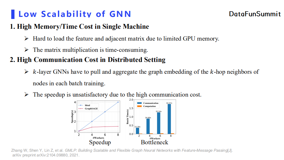 但是在分布式场景下GNN的训练又会面临严重的通信开销问题。例如我们在Reddit数据集用分布式训练的方法训练两层的GraphSage,在这个过程中计算系统的吞吐量来观察分布式训练带来的计算加速增益。我们的实验环境是一台机器两个GPU,每个GPU就是一个worker节点。从实验结果图中我们可以观察到,随着worker节点的数量增加,计算加速增益距离理论上理想的加速效果有很大的差距,而究其原因正是巨大的通信开销。
