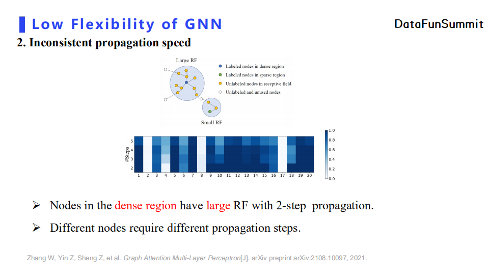其次,GNN中节点的消息传播速度存在不一致性。具体来说,我们将感受域(RF)定义为节点与其消息传播后能影响到的节点的集合,那么若一个节点处于连接比较稠密的区域则两步消息传播后其RF就很大,即消息传播速度较快。从上图可以看出,蓝色点与绿色点虽然都是通过两层消息传播层,但是蓝点明显聚合了更多邻居节点的信息。