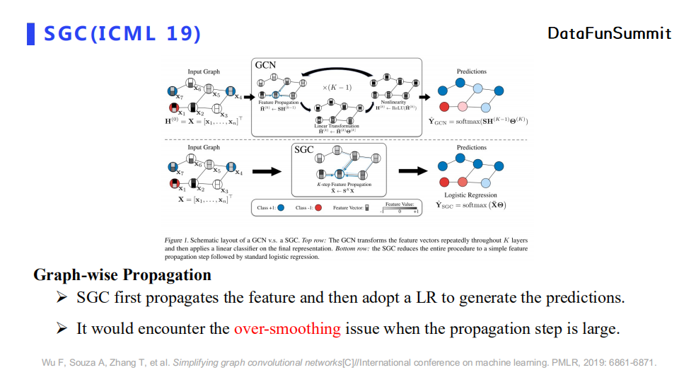 SGC采用了图层次的消息传递。它设置了较深的消息传播深度,即使得图中每个节点都可以聚合多跳的邻居节点特征,最后使用一个简单逻辑回归模型进行分类。但是SGC仅仅使用了最后一跳的信息,并没有充分利用不同跳的节点特征。此外,当消息传播深度较深时,SGC会出现过平滑问题。