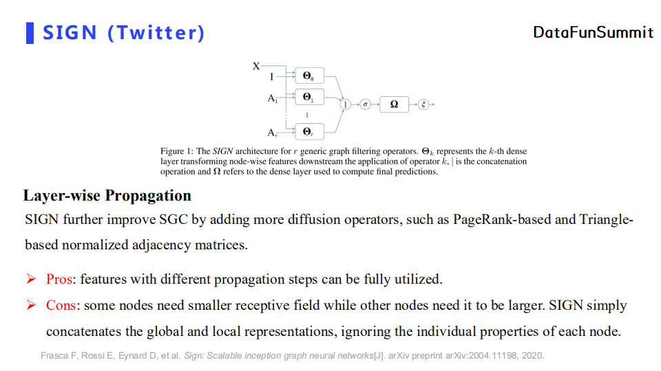 SIGN解决了不同跳的信息没有充分利用的问题,它将不同跳的特征做了拼接操作,并将其输入至一个简单的MLP。相较于SGC,SIGN提供了更多的传播算子(diffusion operator),比如PageRank或者三角计数。但是,SIGN的缺点在于它并没有注意到不同节点所需要的传播深度不同的问题。如果跳数K取得非常大,那么后续拼接的特征都是过平滑特征,也就引入了很多噪声信息,最终导致模型性能不佳。