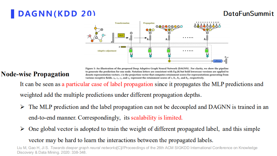 DAGNN和我们的工作比较相似,都属于节点层面的消息传递范式。它首先对每个节点的特征使用MLP进行映射,得到每个节点的伪标签值。之后,DAGNN会使用node-adaptive的消息传递,使得每个节点学习聚合邻居节点特征时的权重值。但是DAGNN在消息传播之前使用MLP,这导致我们需要得到训练后生成的节点embedding来做消息传递。而如果我们在处理超大规模图中使用了分布式训练方法,我们需要在消息传递之前拉取其他worker节点上存储的节点embedding,从而产生大量的通信开销。简单来说,DAGNN训练了多少个epoch,我们就需要拉取多少次节点embedding。此外,我们认为DAGNN在学习自适应聚合权重时仅仅使用了一个门机制,其表达能力是有所不足的。