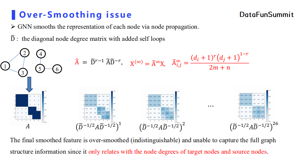 当我们使用归一化邻接矩阵将节点特征传递无限次之后,等价的邻接矩阵第i行第j列元素仅与节点i与节点j的度数以及图中节点与边的数量相关。上图可以直观地看出节点传播深度过深后导致的过平滑问题。