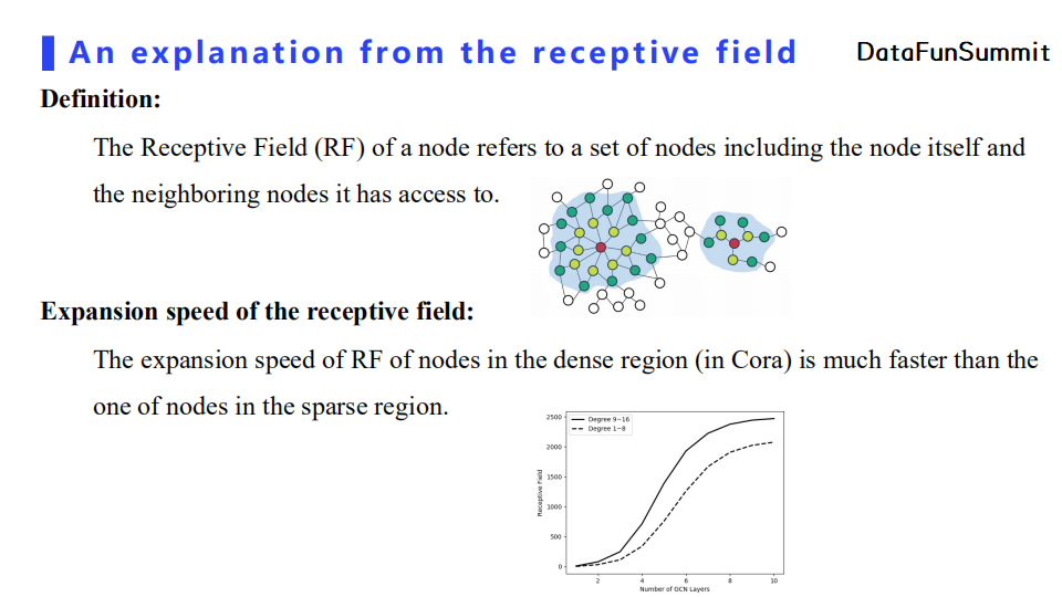我们从RF的角度来解释消息传播速率不一致的问题。如上图所示,图中左侧红色节点与右侧红色节点相比,同样经历两条的消息传播,其传播速度更快,对应的RF扩张速率也更快。我们在Cora数据集上对稠密连接区域和稀疏连接区域做了RF的对比实验,结果也表明稠密区域的RF扩张速率更快。