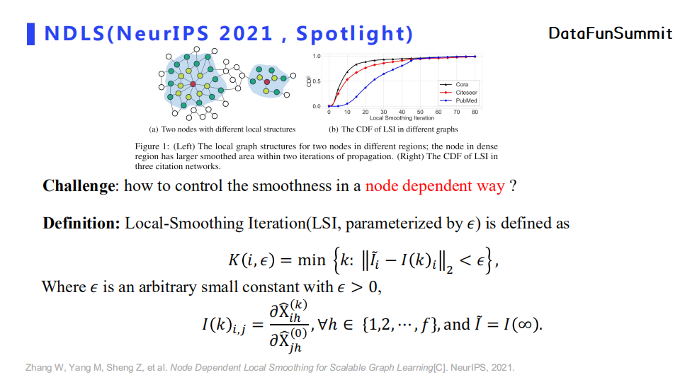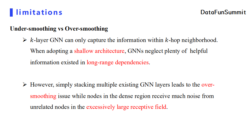 这就带来了under-smoothing以及over-smoothing这两个问题。如果像目前主流的方法,采用两层或者三层的GNN来解决over-smoothing问题,那么节点之间长期依赖关系就无法捕捉到。这个问题在图中节点特征较少的情况下非常常见,比如在推荐系统场景下新用户冷启动问题(节点特征较少,边的数量较少)。而解决这个问题的做法是使用较大的消息传播深度来增强图表达能力。以上即为under-smoothing问题。另一方面,over-smoothing问题,即无论节点处于稀疏连接区域或者稠密连接区域,节点在聚合过多跳的特征之后没有区分度。