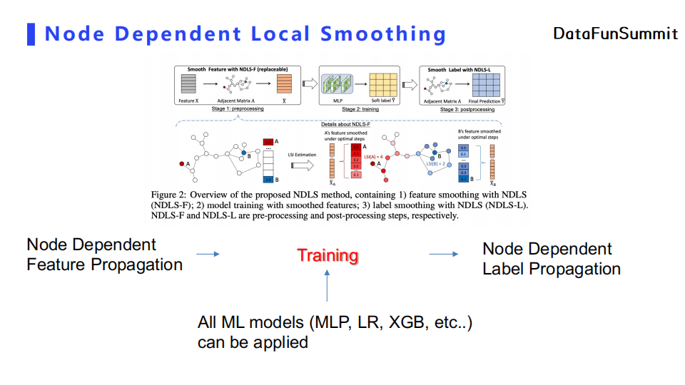 NDLS的框架由Node Dependent的特征传播,特征训练(可以使用MLP等任意机器学习模型)以及Node Dependent的标签传播组成。上图给出了一个直观的解释。例如A节点其传播深度为4,而B节点其传播深度为2。最后,在节点传播K跳之后,我们可以把之前所有K跳的特征做一个平均。