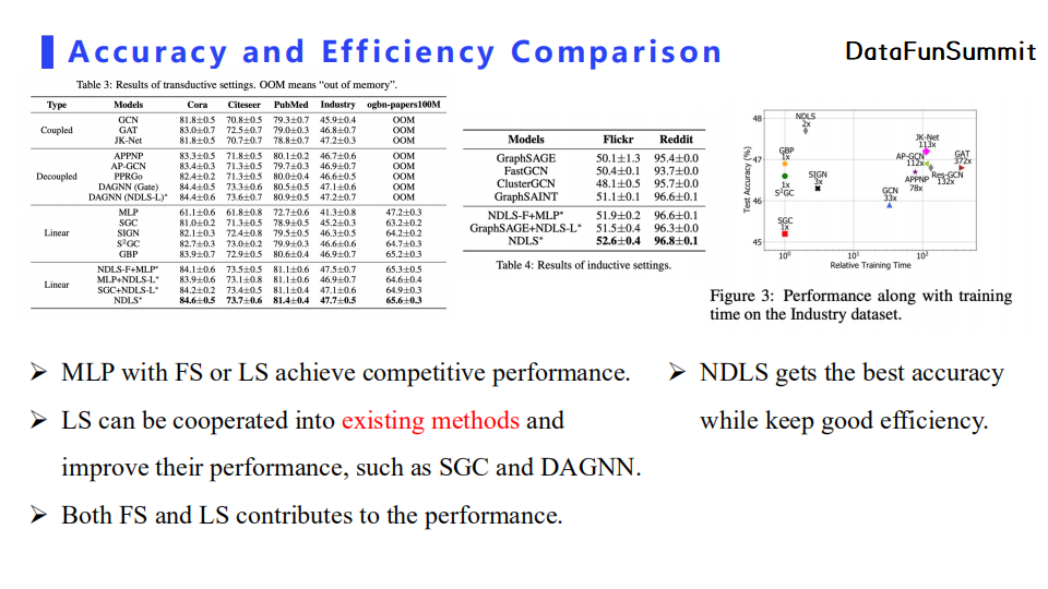 从实验结果可以看出MLP在加入Node Dependent特征平滑(FS)以及Node Dependent标签平滑(LS)后都可以取得性能提升。此外,LS可以作为一个插件直接使用到现有模型中来提升它们的性能。最后,NDLS在取得高精度的情况下可以保持较好的计算效率。