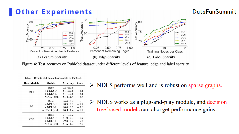 我们对图数据进行采样得到一些稀疏图,并在稀疏图中进行了对比实验。实验结果表明模型使用NDLS后,在稀疏图中相较于基线模型都得到了性能提升。