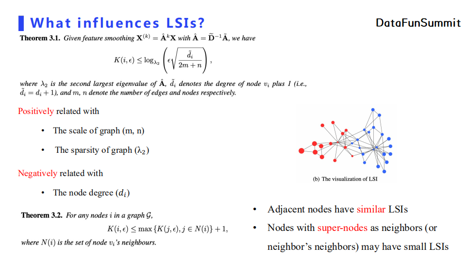 我们的工作中也包含了理论分析。具体地,我们想要知道什么因素可以影响LSI的效果。LSI主要以图的边数量、节点数量以及图的稀疏性呈正相关关系,而和节点度数呈负相关关系。从上图理论3.2也可以看出,如果图中一个节点的邻居节点的度数很大,那么它也会有一个较小的LSI;而且相邻的节点LSI也相近。上图中右侧可视化展示表明越靠近稠密区域的节点其LSI也越小。