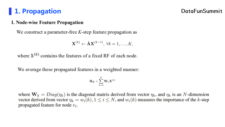 我们首先需要进行node-wise的特征传播。和SGC类似,节点可以得到K跳内所有其他节点的特征信息。特征聚合使用的是加权求和的形式,其权重矩阵Wk是一个对角矩阵,矩阵中的第i行第i列的元素值代表节点i在K跳传播后的特征的重要性权重。