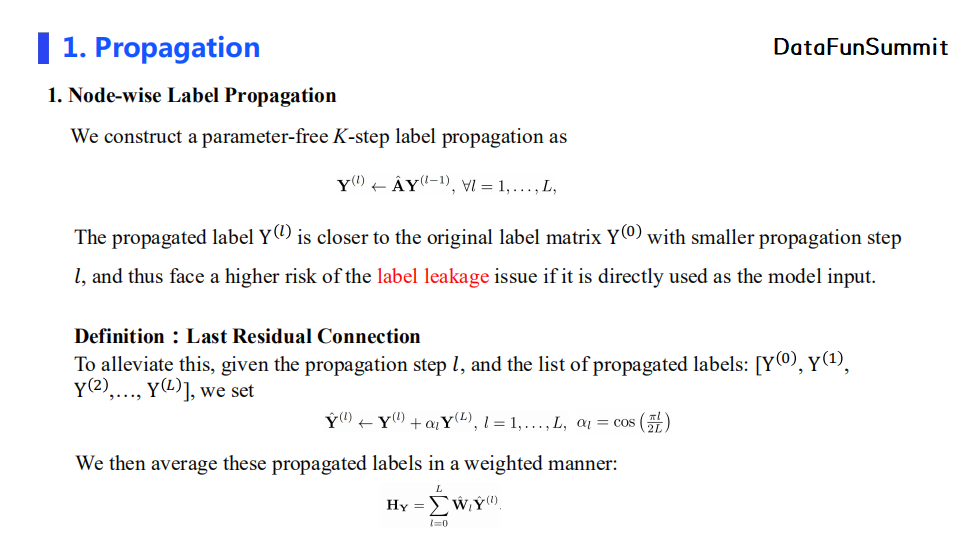 类似地,我们还会进行node-wise的标签传播。但是值得注意的是,如果我们直接像node-wise特征传播一样直接计算加权融合特征,由于在跳数l较小时传播标签值与原始标签值相近,则简单加权求和会有标签泄漏的问题,导致学习的权重值偏向较小跳数的传播特征。针对这个潜在的问题,我们采用了Last Residual Connection的方法。具体地,第l跳的传播标签特征会加入最后一跳的传播特征,其加权系数与当前跳数有关,且它会随着跳数的增大而减小(使用cos函数)。