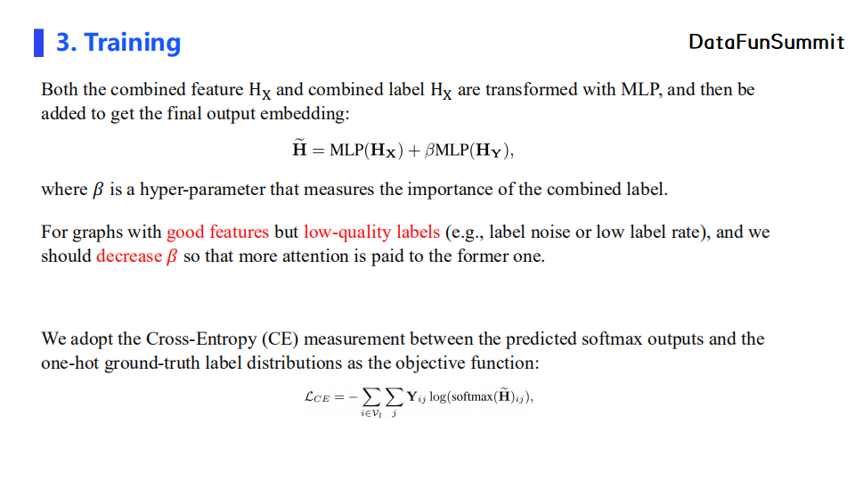 模型中的MLP部分有两个分支,一部分用于对节点自适应传播特征进行变换,另一部分则对节点自适应传播标签进行变换。最终的输出特征通过β参数进行加权求和,我们可以通过调节β值来控制两者的重要性。如果我们的输入图拥有较好的节点特征,但其标签质量较差,那么我们可以减小β,使得特征更加关注于节点传播特征。模型的目标函数使用交叉熵损失函数。