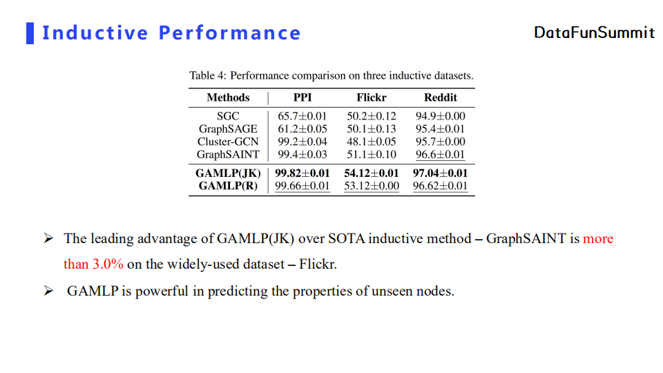 其次,在归纳式(inductive)学习的设定下,GAMLP比SOTA的方法有超过三个点的性能提升,证明了GAMLP可以有效地对未知节点的属性进行预测。