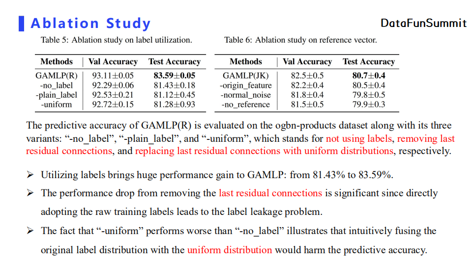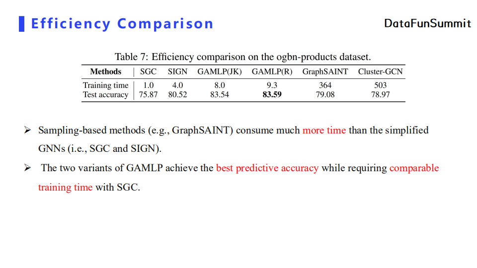 接下来,针对模型效率我们也进行了对比实验。GAMLP虽然比起SGC和SIGN在单机上要慢一些,但是我们的预测精度比较好,而且训练时间也不会相差太多。相对地,采用图采样的模型比采用解耦思想的模型训练时间要多出不止一个数量级。