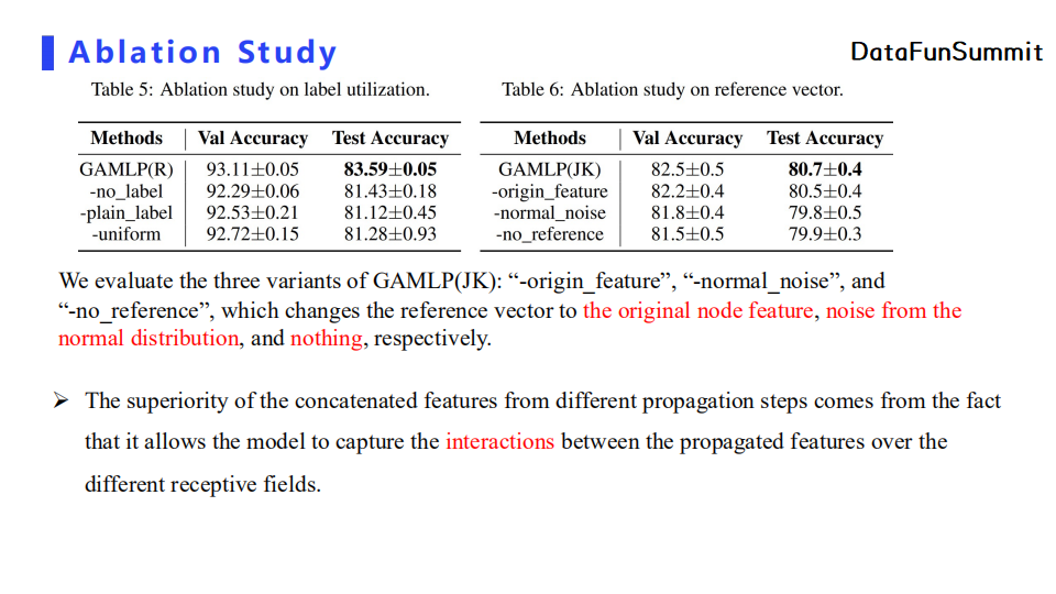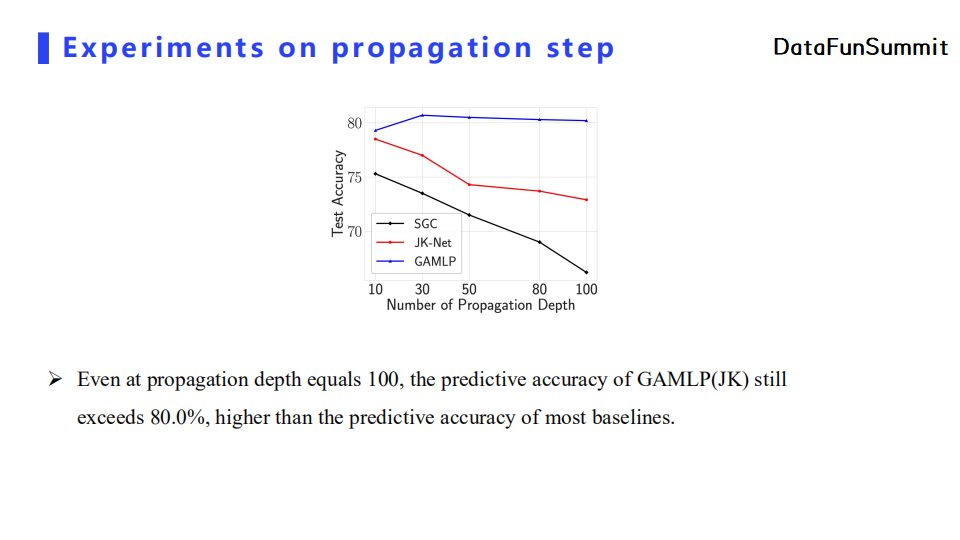 我们对传播深度也进行了对比。当传播深度为100时,GAMLP的分类精度依然可以达到80%以上,远超其他基线模型。这在实际应用中会有很大的好处,因为GAMLP不需要针对不同类型的图对模型深度进行调参。