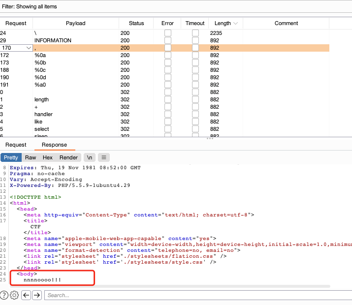 首先进行fuzz,看看参数值处过滤了什么字符,便于用于后面SQL注入的payload构造。