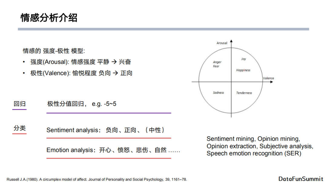 实际上,我们还可以把情感以量化的方式在二维笛卡尔坐标系上进行展示,这就涉及到了情感的强度和极性模型了。首先,上图右侧坐标系中,X轴代表极性(Valence),表明情感的愉悦程度(负向→正向);Y轴代表强度(Arosual),表明情感的强度(平静→兴奋)。极性分值一般的取值范围是-5~5。这个模型实际上把情感进行了量化。目前有很多开源的数据集也是基于回归的情感打分的方式来制作的,那么对应的模型解决的便是一个回归问题。
