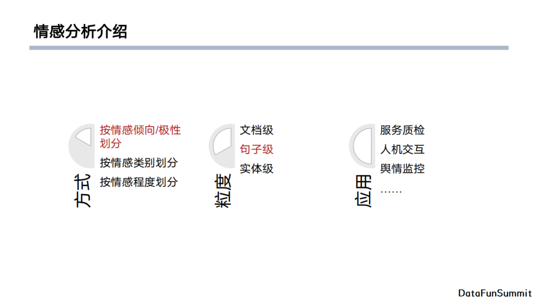 首先,从方式角度来讲,情感可以按照倾向、类别以及程度进行划分。从粒度上来讲,从粗粒度至细粒度可以分为文档级、句子级和实体级的情感。文档级是对一整篇文档或者多句句子组成的一段话进行整体的情感判别;句子级更多地被使用在对话场景中,即从一个人的对话中抽出一句或者多句语句,并其继续情感判别;实体级的粒度则更加精确,它对给定目标进行情感判断,比如”电脑非常好,但是它的键盘太丑了“,如果给出的实体是”键盘“的话,情感的判别结果应该为负向的。从应用的角度来讲,如果在文本+音频的范畴内,我们更关心服务质检、人机交互、舆情监控,当然也会有一些其他领域的应用期待大家去发掘。