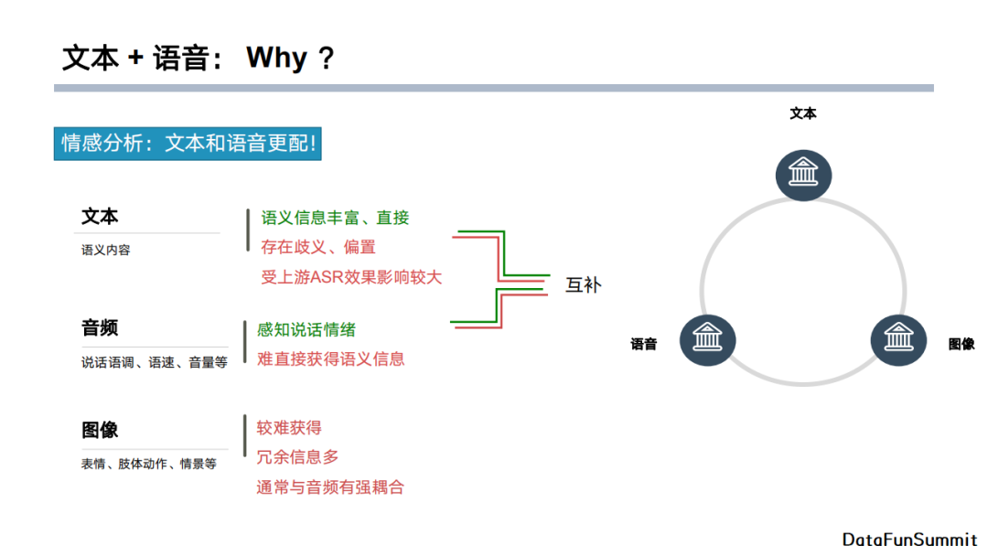 假如我们想要给“文本”这个模态找一个搭档,那么我们提出“语音”和“文本”更加般配。这里我分析一下文本、音频和图像的特点。