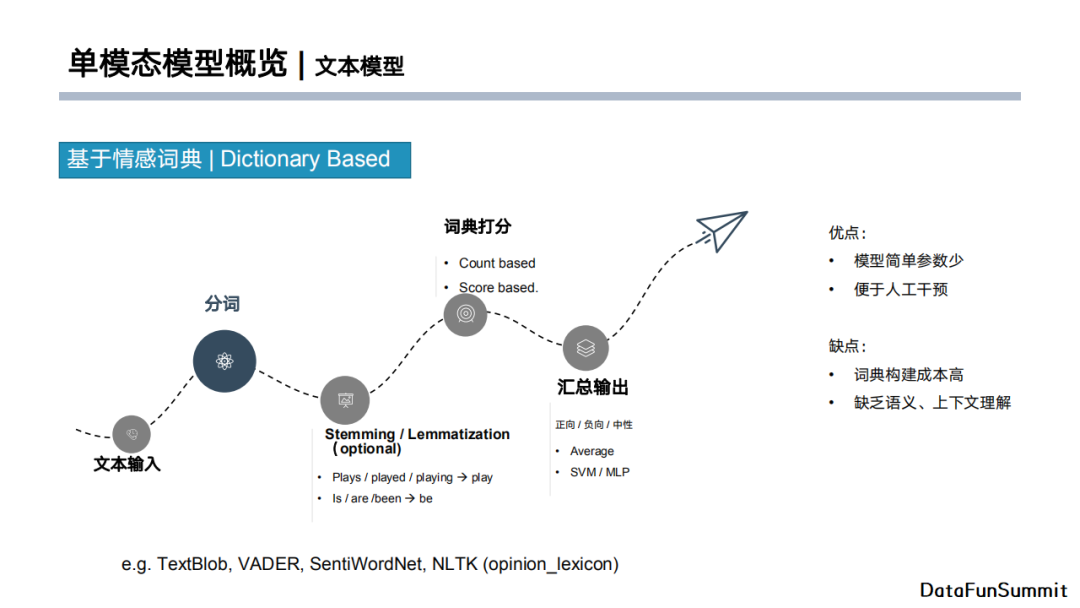 首先,文本模型中经典的做法是基于情感词典,基本上遵循以下流程。第一步,我们对文本输入进行分词,之后提取每个词的词根,并根据词典进行打分,最终得到一个汇总输出后的结果。词典的构建方法有按照分类的方法构建以及基于计数的方法。这种方式的优点在于模型的参数很少,并且我们很容易地能进行人工干预,但是词典构建的缺点在于构建成本较高,且词典与词典之间的共性较低。有时候我们因为某种原因调整了一个词来达到一个具体目的,但是对于其他场景就会产生干扰。另外,这种方法是基于单个词来做情感打分的,它缺乏语义的上下文理解。