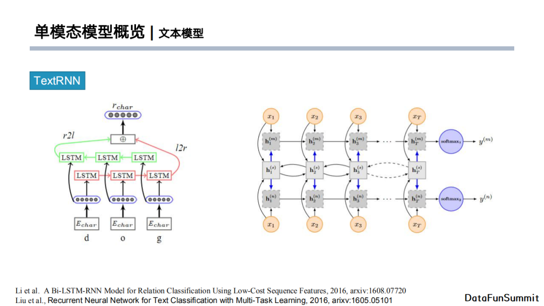 当然,CNN能完成的工作RNN同样也可以实现。我们可以基于字粒度,使用常见的双向LSTM对序列进行建模。它的优点是可以得到长时依赖的上下文信息,比如将双向LSTM中正向隐向量和反向隐向量进行拼接得到最终的向量表达。