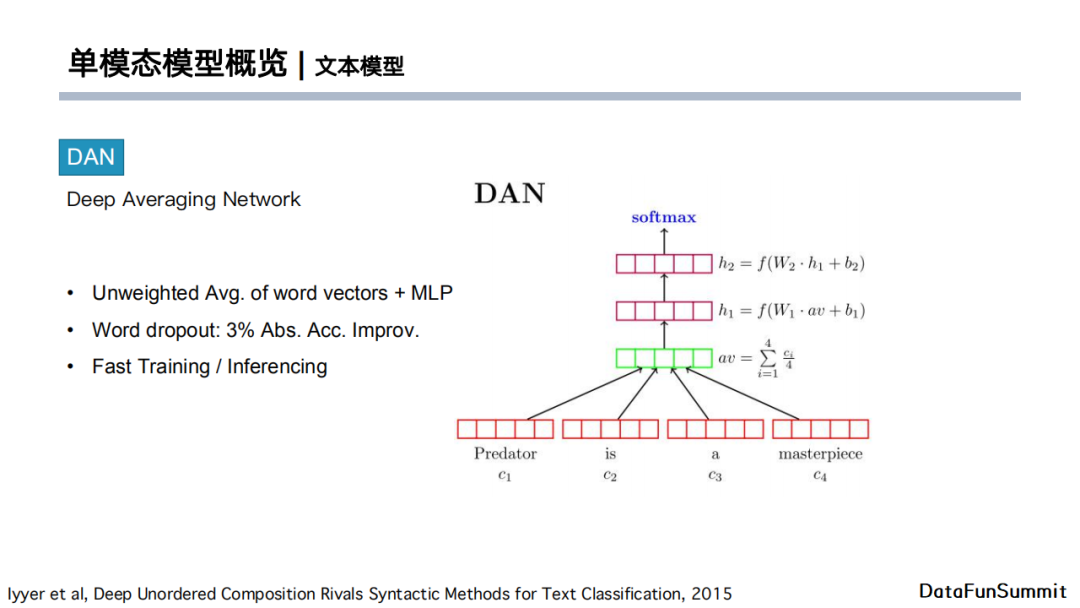 相似地,DAN使用平权的词粒度子向量直接进行简单平均,之后接入两个MLP后根据输出向量执行分类任务。它的最终效果也很不错,之后它还加入了词级别的dropout操作,进行进一步的效果提升。