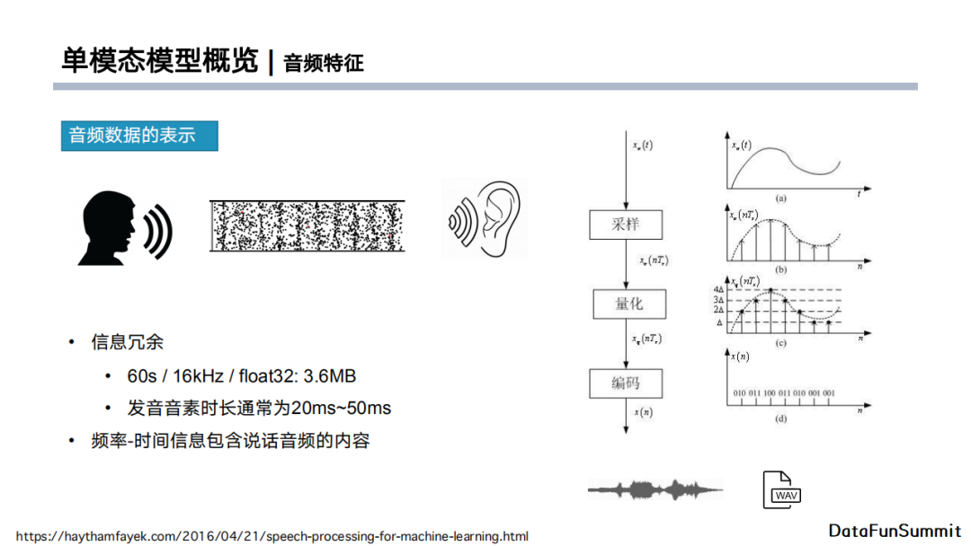 人们说话的声音是经过说话人声带振动,通过压缩空气在空气中传播,最后传入人耳。但是对于计算机,它接收的不是模拟信号,需要将其量化成一个数字信号,即需要经过一个AD转换,通过采样、量化、编码的方式得到。我们想要将信号最终以数字的形式存储,所以经过量化以后得到的数据最终会按照一些协议存储在文件中,如wav、mp3格式的文件。那么我们能不能直接通过一些工具把音频数据读进来并送入模型呢?严格来说是可以的,但是会包含信息冗余。首先,我们发音的音素时长通常在20毫秒到50毫秒左右,而且频率-时间信息包含说话音频内容。实际上它更多的是与频率相关,所以我们更关心的是频率随时间变化的信息。