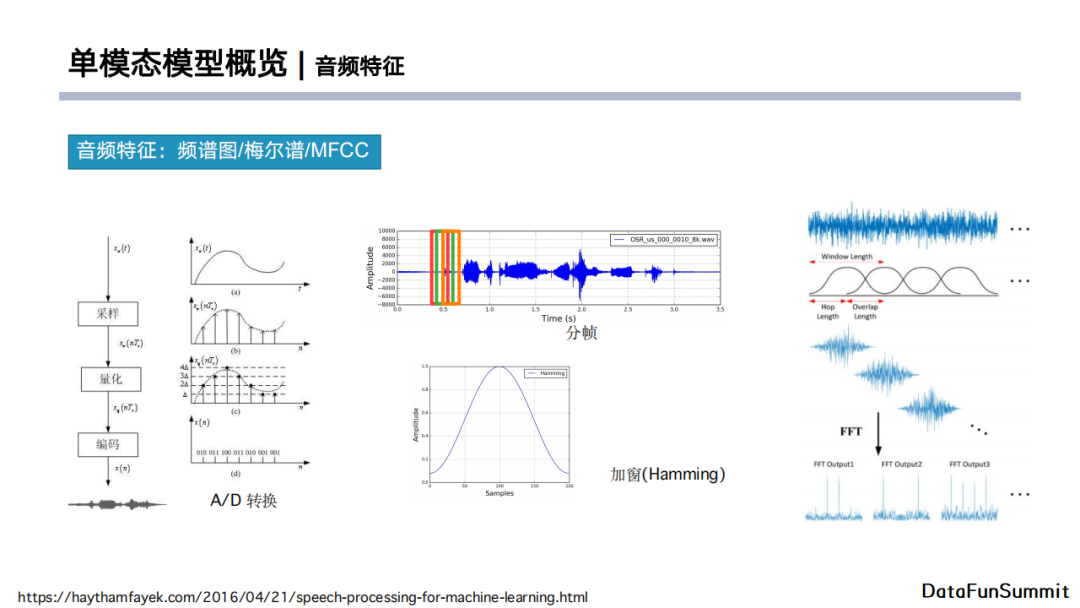 我们需要把原始的波形信息转换成频率信息,这就涉及到音频特征,如频谱图、梅尔谱、MFCC等。通过A/D转换,我们可以得到电脑可以存储的音频;下一步我们对转换后的音频做分帧,使用小的窗口(大约25ms)按照一定的步长进行滑动。每一个窗口并不是完全分离开的,它实际上是有一些重叠部分,称作overlap length。我们截取滑窗后每一段小的音频输入加上汉明窗做平滑与频谱变换,最终得到频谱图。