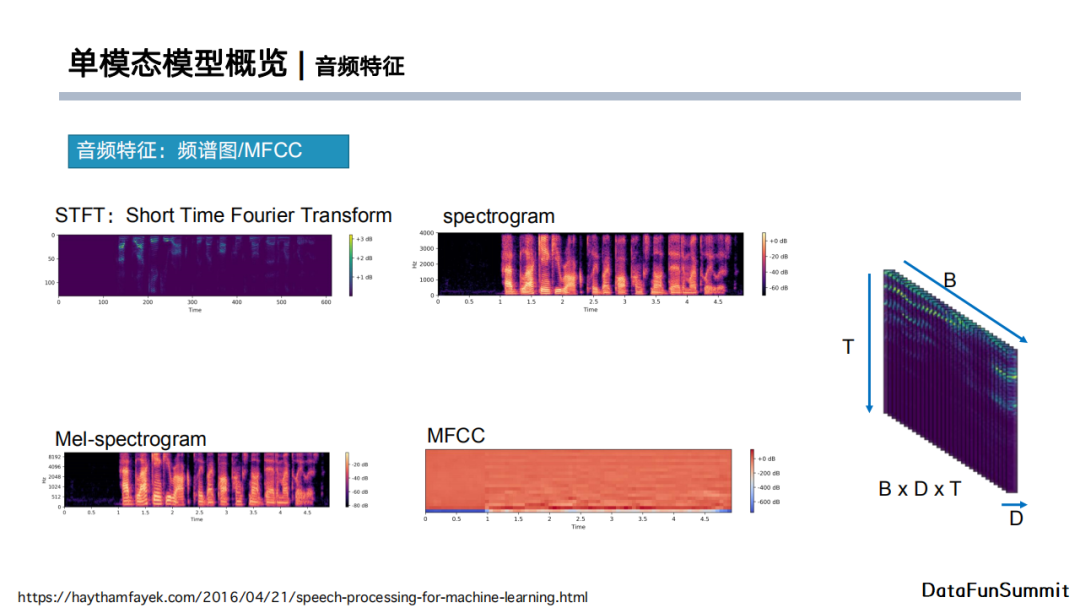 上图分别展示了短时傅里叶变换的频谱图,对纵坐标取对数后得到的频谱图,经过人类声学角度进行改进的梅尔频谱图以及梅尔倒频谱系数(MFCC)。通常我们使用mini batch的形式将数据输入至模型,所以数据的时间维度是T(将所有音频处理成一样的长度),梅尔谱的维度是D(一般取13),batch size的维度是B。梅尔谱的输入数据可以看成是一个单通道的图像,横轴是时间,纵轴是每一个时刻的特征维度。除了上述特征,在早期阶段人们还会使用Low Level Descriptors(LLD)。它们基本上是通过人工对一段音频进行统计学分析,得到一个一维的向量。但是,近期大部分针对音频的工作都会采用类似于梅尔谱的特征作为输入。