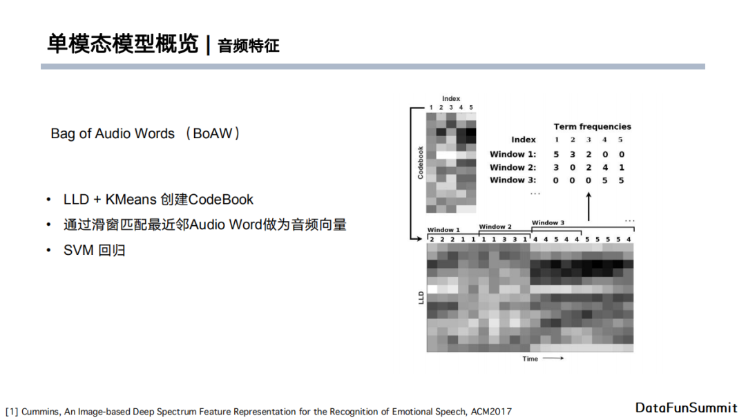 在早期的音频领域的很多概念是尝试从CV或者NLP领域中借鉴得到的。例如NLP中的词袋模型Bag of Words,在音频领域就产生了Bag of Audio Words的想法。它对LLD特征进行加窗,针对每个窗口的LLD使用KMeans进行聚类,得到的类别中心就可以构成一个CodeBook(相当于NLP领域的词典)。在使用CodeBook时,我们会对输入的LLD进行滑窗,匹配CodeBook中最近邻Audio Word的LLD做为音频向量。这个方法完全依照词袋模型,但是它忽略了音频和文本之间的差别。文本是离散化数据,但是音频是一个模拟信号,数字化后也是一个近似于连续的表示,其状态空间会远远大于文本的状态空间。