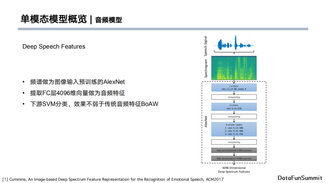 于此同时,有人提出借鉴CV领域的方法来处理频谱图。上图展示的工作使用了预训练的AlexNet,将音频的频谱图作为输入得到4096维的隐向量,将其作为音频的向量表示。这相当于从图像角度进行处理,其下游的分类器使用的是SVM。最终得到的效果不弱于传统音频特征BoAW。这篇文章是使用神经网络来提取音频特征的早期尝试,目的是为了替代人工提取的特征。