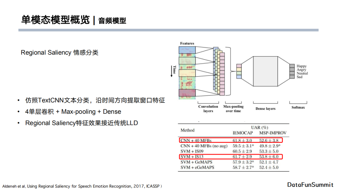早期也有人尝试借鉴TextCNN模型来对音频进行情感分类。如果沿着时间方向提取窗口特征,实际上我们也可以将音频看作一段文本。那么我们可以使用相同的方法,使用不同大小的卷积核进行滑窗卷积操作,然后使用max pooling得到每个卷积层的特征,最后使用MLP进行分类任务。实际上,它是完全按照TextCNN的结构并迁移至音频分类任务。从效果上来看,作者通过对比实验发现其特征效果接近传统LLD。