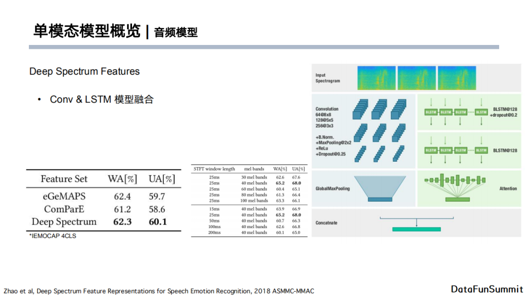 当然,我们也可以同时使用卷积层和LSTM来提取音频特征。上图展示了两种模型融合的方法,其基本思路是先通过卷积层与LSTM分别提取特征,之后将两种特征拼接起来,进行分类任务。从效果上来看,这个方法在IEMOCAP数据集上超越了手工提取特征的方法。